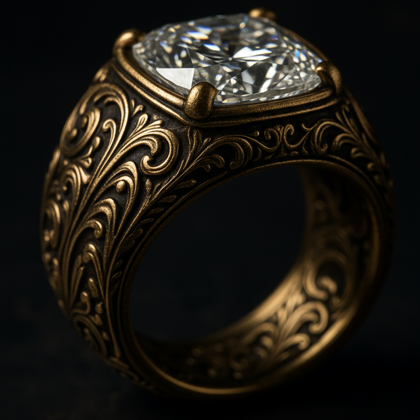 Inspired by India’s imperial courts and Mughal architecture, Maharaja’s Legacy gleams with sculpted gold and a cushion-cut diamond that commands attention.