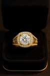 Accent Stones: Hand-set round lab diamond halo + side accents