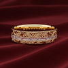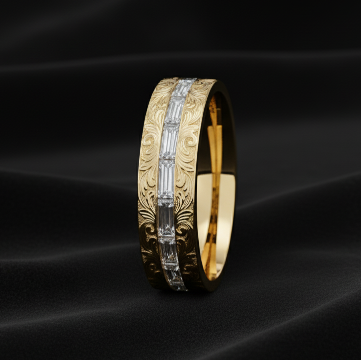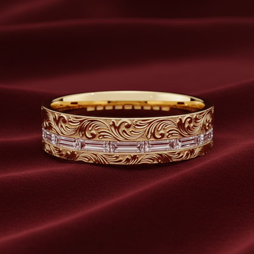 Acanthus-engraved 18k gold band with baguette-cut lab diamonds set in a continuous row. Elegant, balanced, and made to endure.